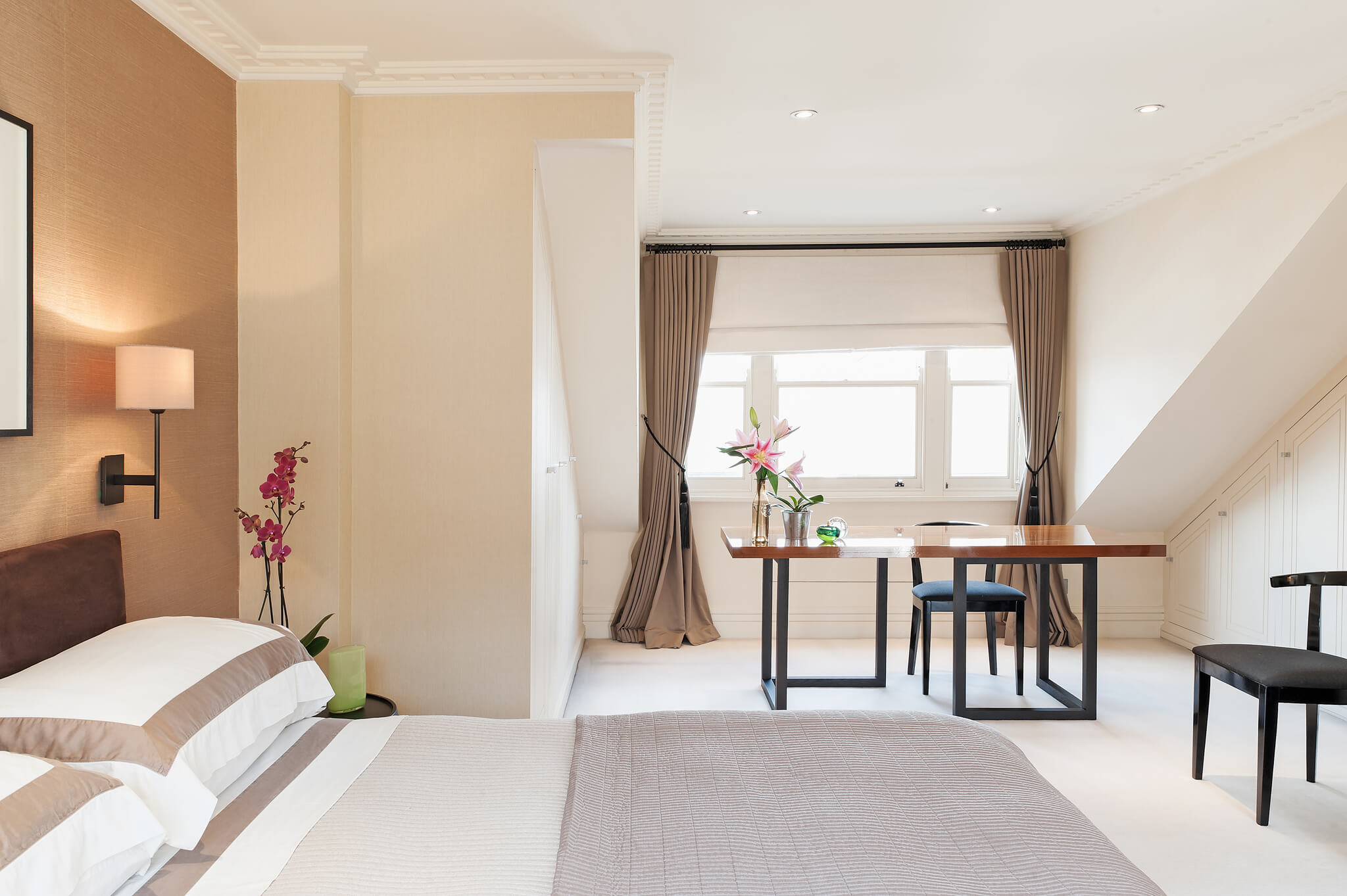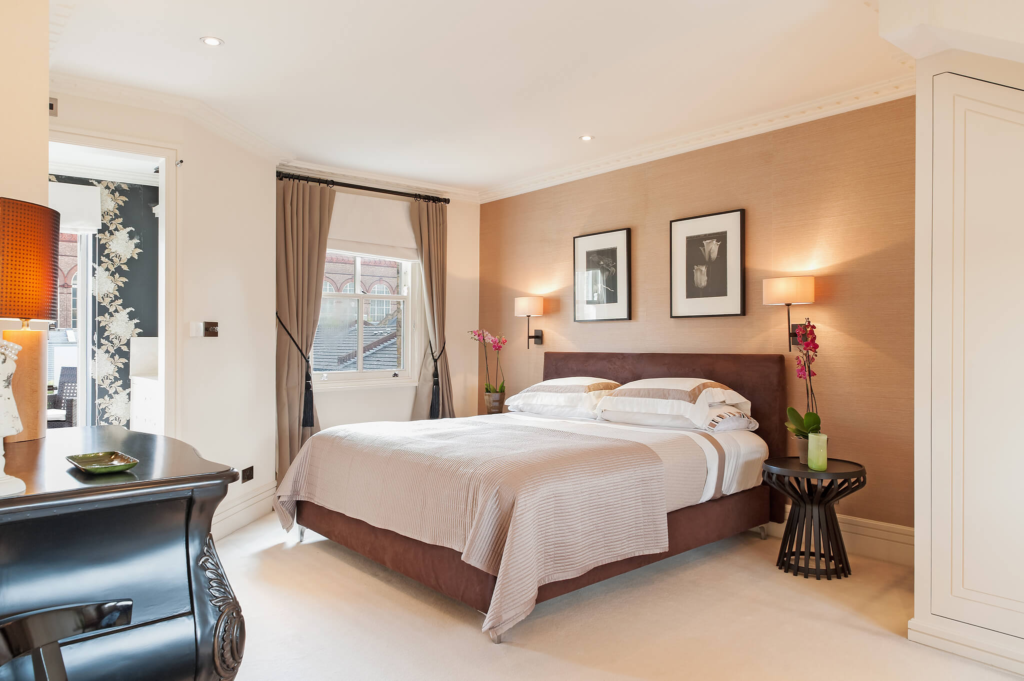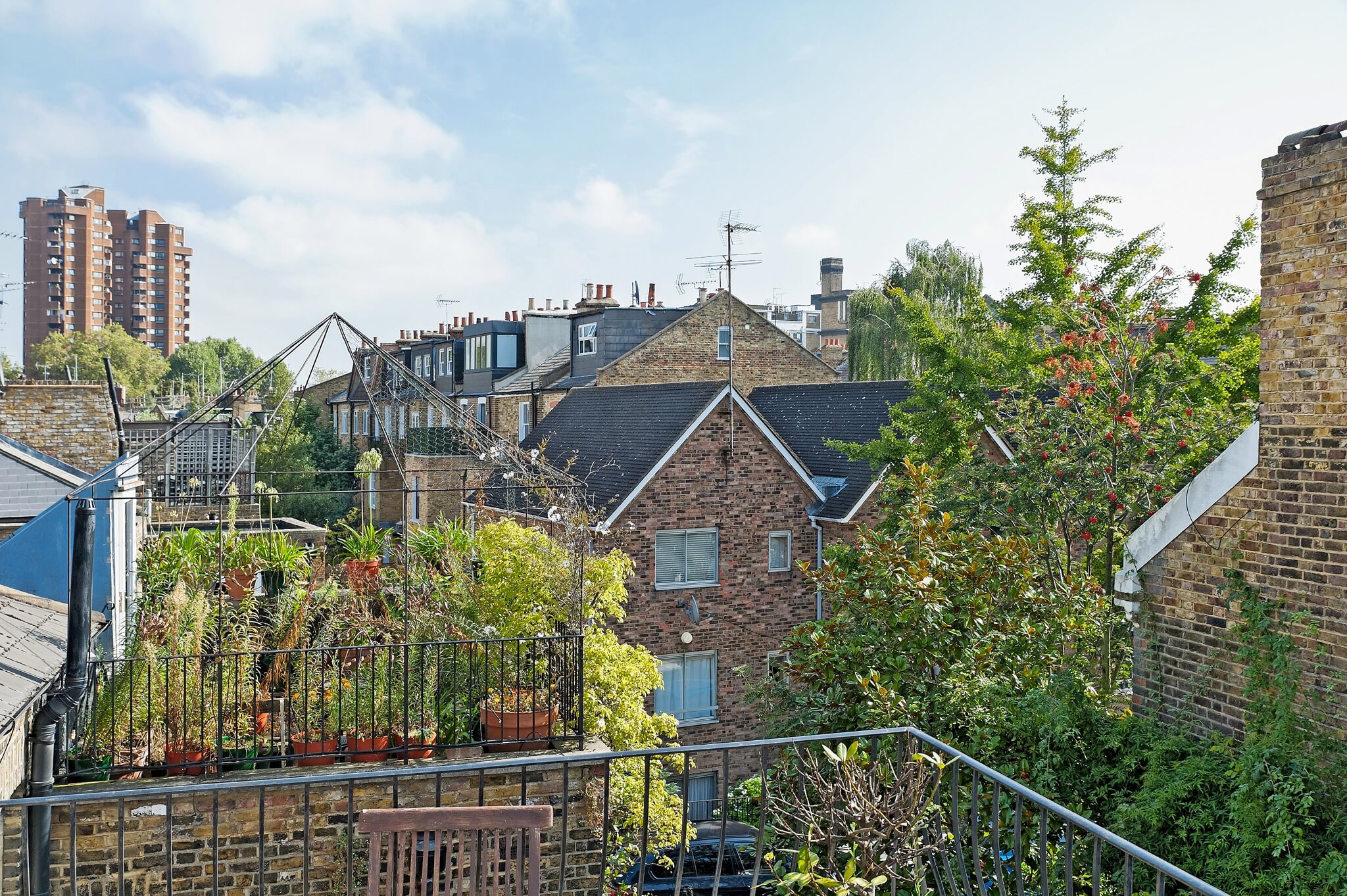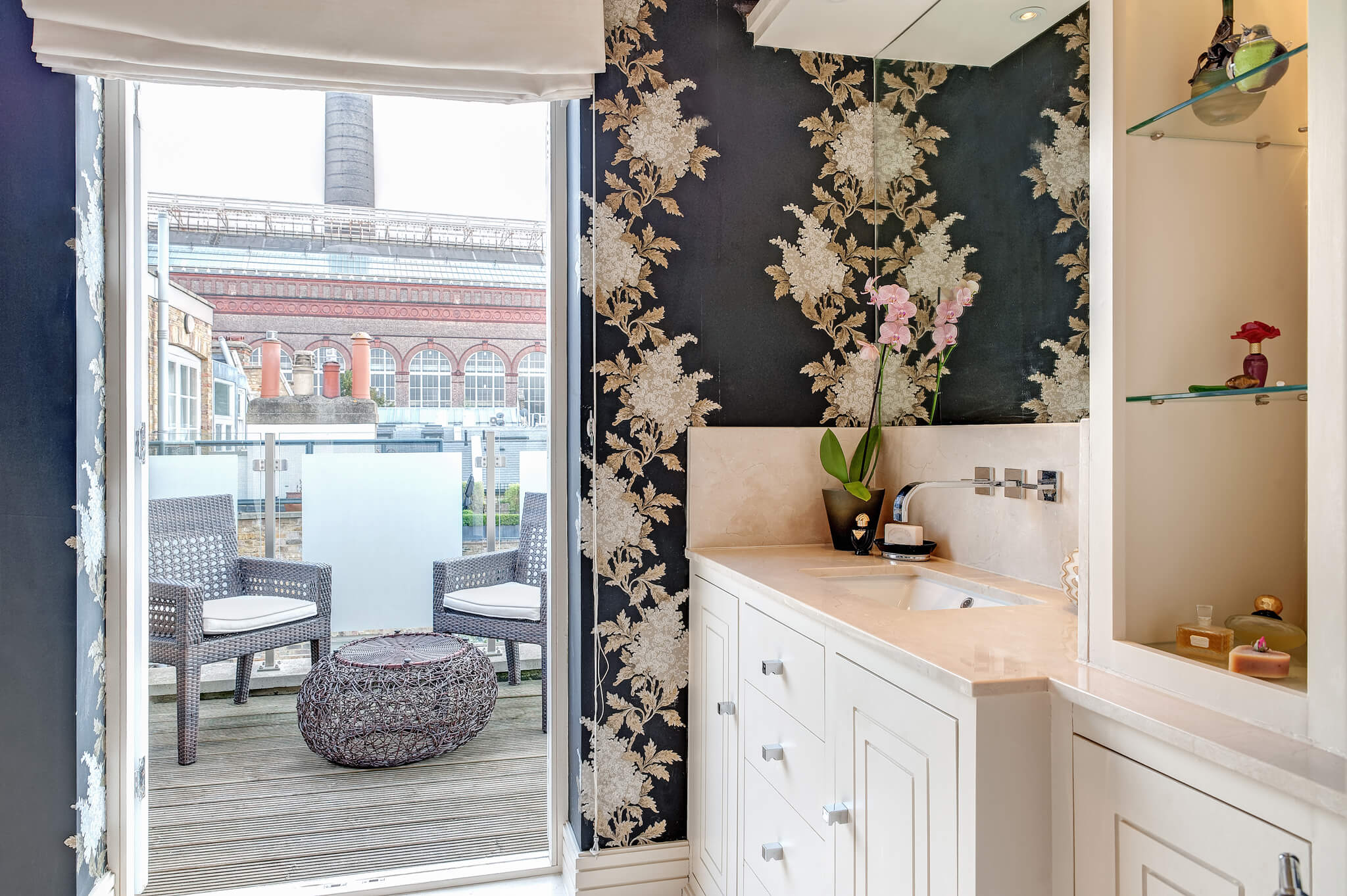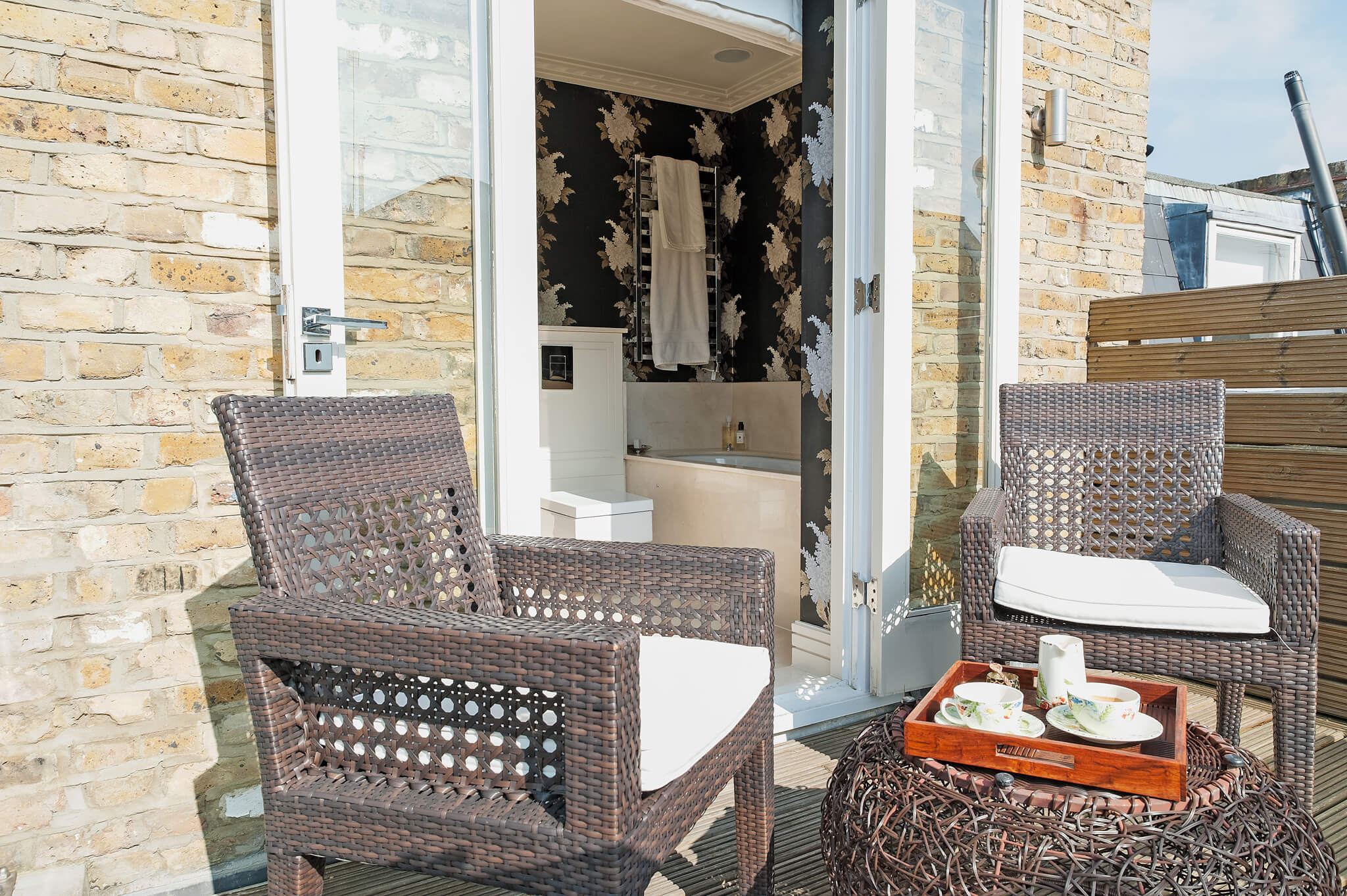 The property presents clean lines and rich textures, and will afford you a tranquil respite from London’s hustle and bustle. Upon entering the townhouse, you are welcomed into the comfortable and chic living and dining room, equipped with plush seating, a flat-screen TV, an upright piano, and a dining table. The chef’s kitchen is fully equipped, including a gas stove, ideal for gourmet cooking. The kitchen opens onto the first of two charming and private outdoor spaces, a south-facing patio and garden perfect for enjoying an English breakfast or lounging with a glass of wine after a day exploring London. Continuing up the stairs from the living room, you will reach the second floor bedrooms and bathroom. The first bedroom boasts a double bed and a window overlooking the backyard garden below. The second bedroom features a queen bed, a full wall of closets, and a comfortable desk. At the end of this hallway, there is a full bathroom with soaking tub and built-in TV, as well as a full vanity and toilet. The spacious master suite is situated on its own private floor. The bedroom features a generous king bed and en suite bathroom with a modern soaking tub, vanity, and toilet. Just off the bathroom is a private terrace with two cushioned wicker chairs and a small table, perfect for enjoying an intimate moment. On the underground level you will find the fourth bedroom, which features a queen bed, flat-screen TV, and a full wall of closets, as well as a separate bathroom with shower and toilet. The immediate neighborhood is London’s vibrant design quarter, which also boasts many bistros and pubs, outdoor food markets, and notable sports destinations such as The Queens Club, The Hurlingham Club, and The Chelsea Football stadium. If you are interested in high fashion or contemporary art, visit the nearby Duke of York Square and the Saatchi Gallery. AMENITIES: Terrace, balcony, private garden, Wi-Fi, iPad, satellite TV, sound system, washer/dryer, microwave,dishwasher, dvd player with a selection of dvd’s, safe, printer/scanner, umbrellas.